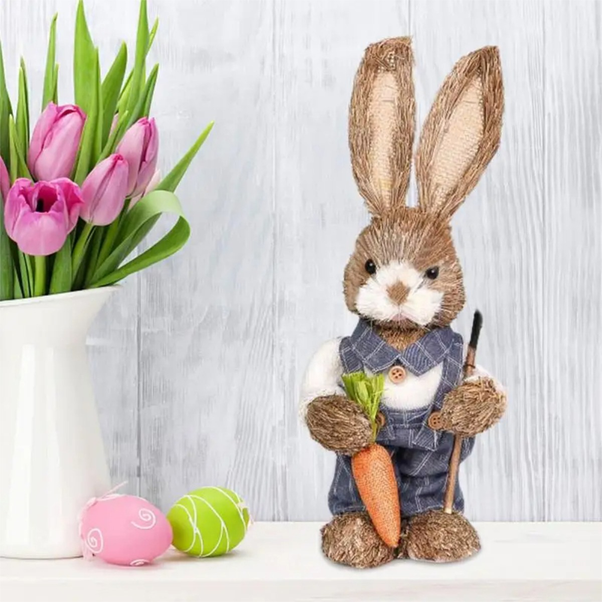 Divertido y decorativo muñeco de paja con diseño conejo jardinero.