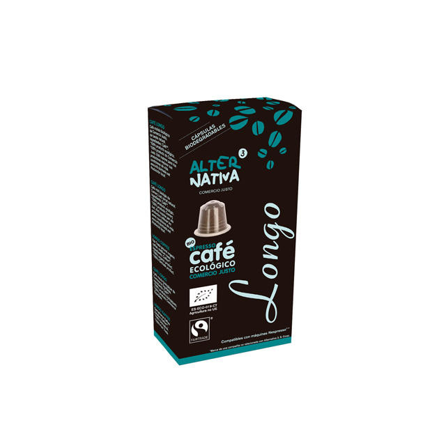 El Cafe Longo Bio de Alternativa3 es una variedad de café longo orgánico y con comercio justo de la marca Alternativa3, disponible en cápsulas aptas para Nespresso. Esta variedad de grano ofrece un sabor aterciopelado y elegante gracias a su blend único compuesto por Arabica proveniente de países centroamericanos y Robusta cultivada en África. La intensidad de esta variedad de café es de 7.