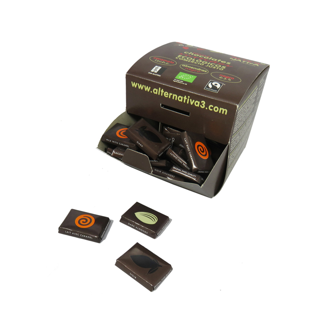 Las Chocolatinas Napolitanas SinGluten Bio de Alternativa3 son el acompañamiento perfecto para tu taza de café. Esta increíble combinación de chocolatinas te ofrece tres diferentes variedades de chocolate: almendras con chocolate negro, chocolate negro y chocolate con leche, además de pequeños trocitos de caramelo. Estas deliciosas chocolatinas se caracterizan por no contener gluten y tener una producción orgánica,¡lo que las hace aptas para todos los públicos!