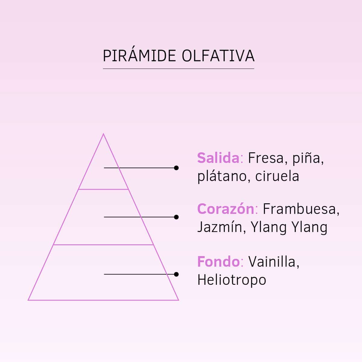 Esta fragancia dulce e intensa, combina los aromas dulces, frutales y cítricos con fondos florales y almizclados. El resultado es un apetecible aroma a golosinas, concretamente a chicle de fresa. Las notas chispeantes de la fresa ácida se fusionan a la perfección con los toques dulces y empolvados, una acertada combinación de aromas que dan lugar a una fragancia divertida, simpática e irresistible que conquista los sentidos. El aroma de chicle es juvenil, jovial, desenfadado y agradable. Evoca la infancia y los momentos felices.