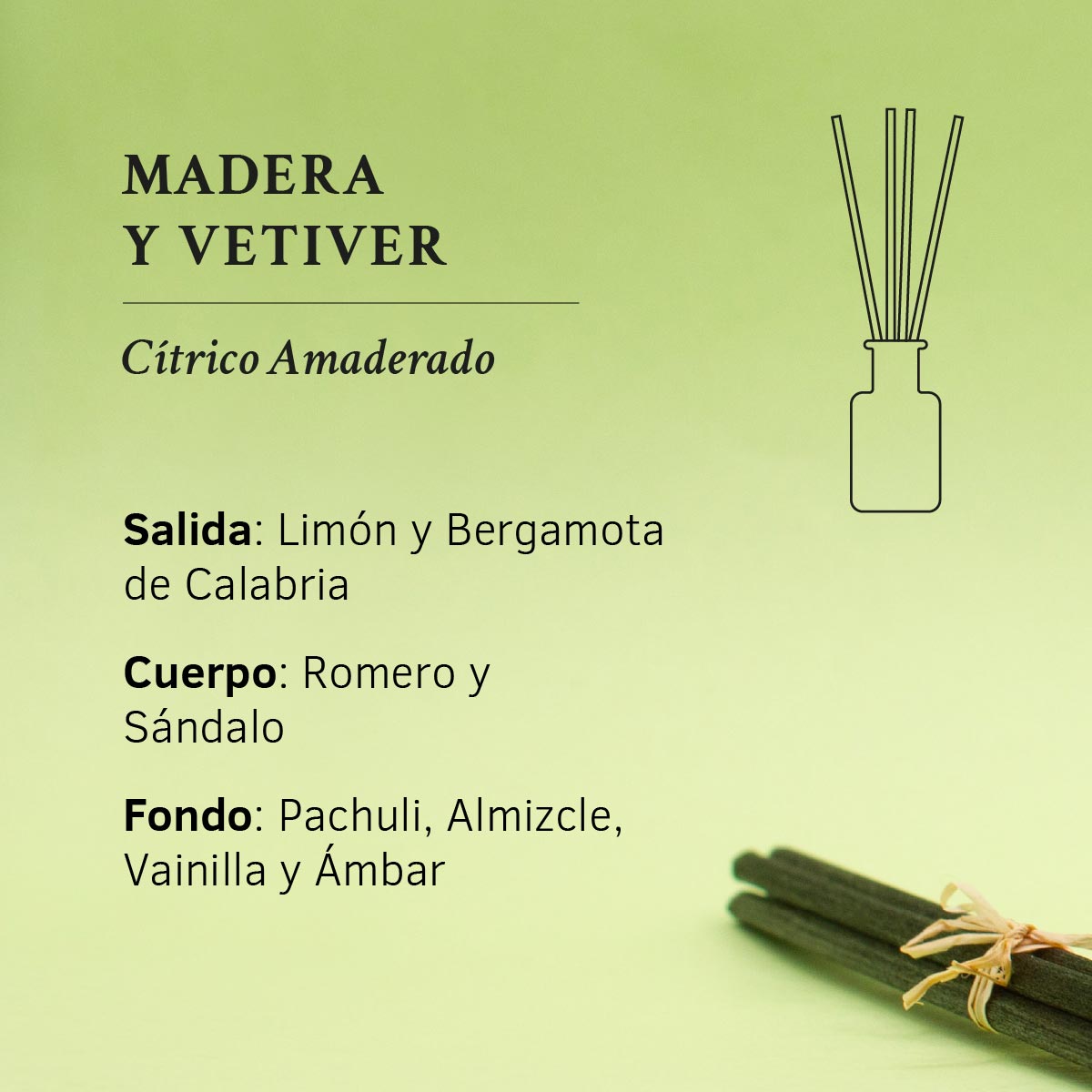 - Notas amaderadas y cítricas: La fusión de madera y vetiver ofrece un aroma intenso y equilibrado, ideal como fragancia para el hogar que aporta frescor, calidez y distinción.