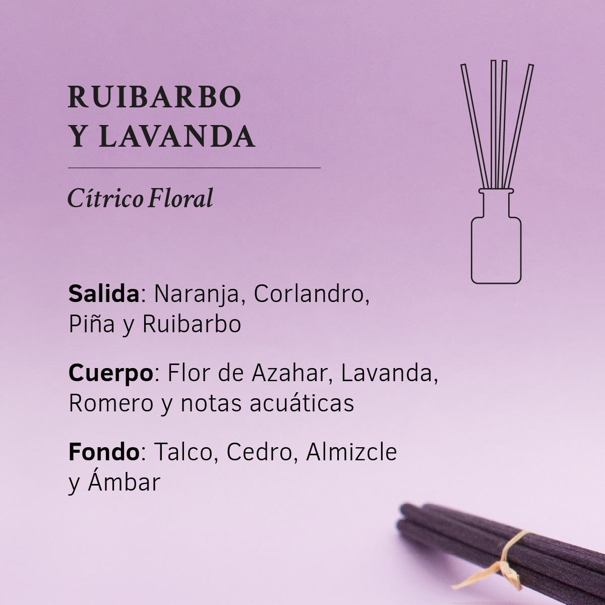 - Notas florales y cítricas: La combinación de ruibarbo y lavanda ofrece una fragancia fresca, ligera y equilibrada, perfecta como fragancia para el hogar que aporta paz y vitalidad al mismo tiempo.