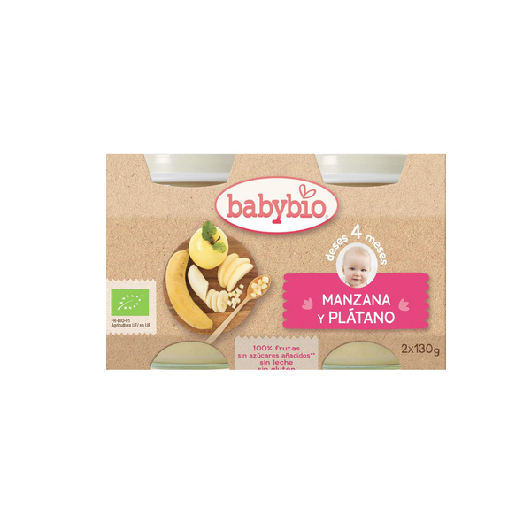 Tarritos Manzana y Plátano 4 Meses de Babybio es un potito de manzana y plátano para bebes a partir de 4 meses. Babybio selecciona cuidadosamente sus ingredientes, 100% procedentes de agricultura ecológica.