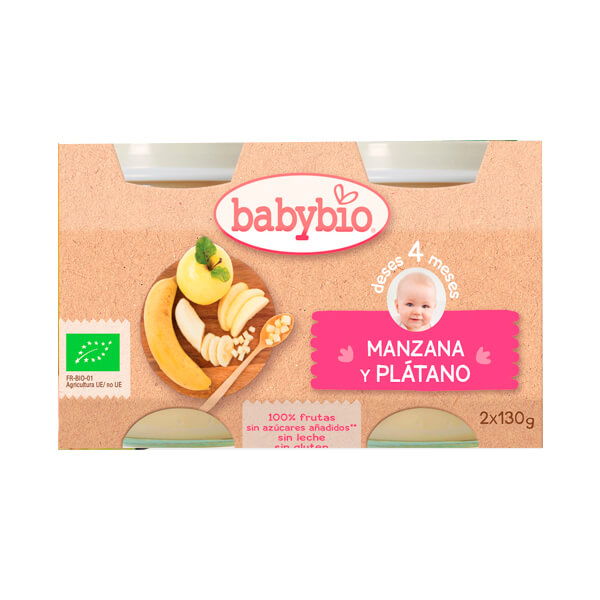 Potito de manzana y plátano para bebes a partir de 4 meses. Babybio selecciona cuidadosamente sus ingredientes, 100% procedentes de agricultura ecológica.