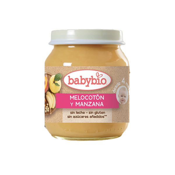 Potito de melocotón y manzana para bebes a partir de 4 meses. Ingredientes seleccionados cuidadosamente procedentes 100% de agricultura ecológica.