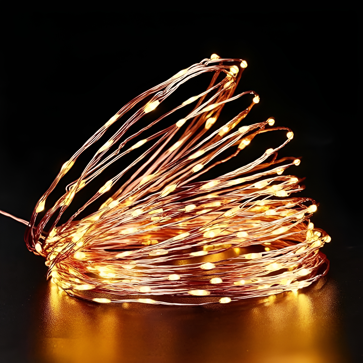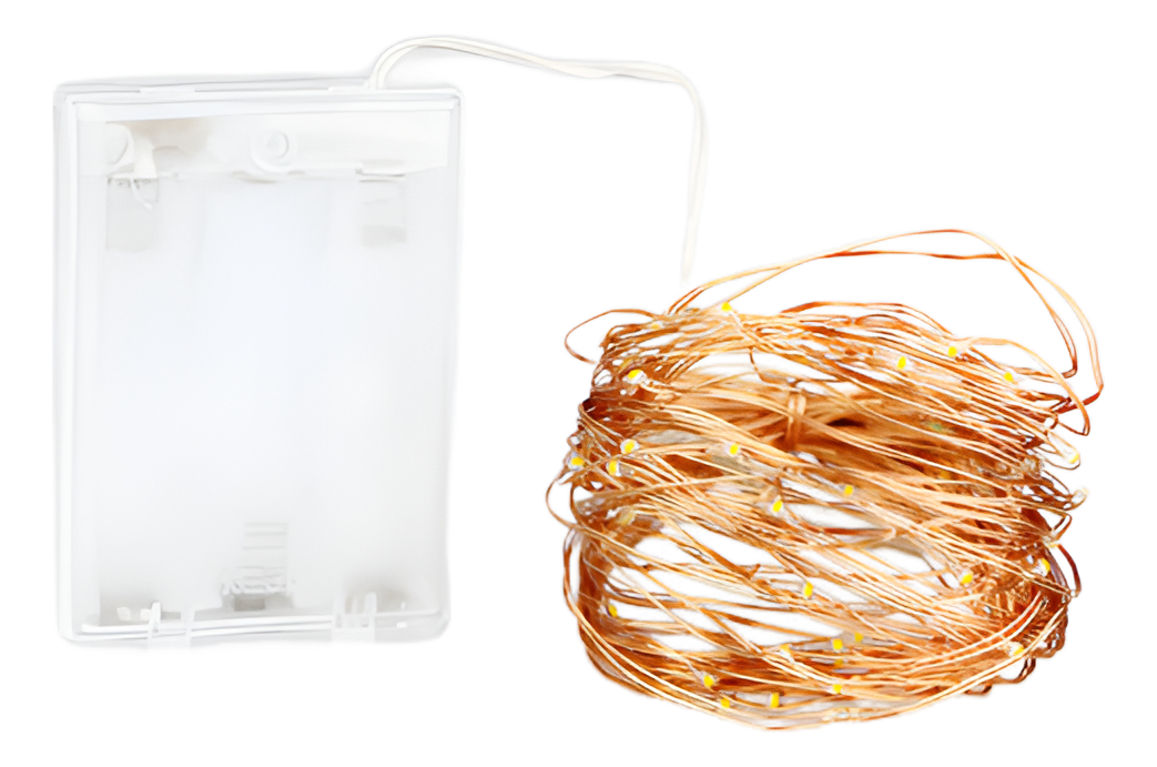 3. Portabilidad y Uso Sumergible: Esta guirnalda se alimenta convenientemente con 3 Pilas Doble AA (no incluidas), eliminando la necesidad de molestos cables y tomas de corriente. La portabilidad la hace perfecta para eventos al aire libre o decoración de zonas de difícil acceso. Lo más impresionante es su capacidad sumergible: todo el tramo de Mini Leds De Cobre 5 Metros puede ser introducido en el agua para decorar jarrones transparentes, centros de mesa florales o fuentes pequeñas (⚠️ Importante: La caja de pilas NO es sumergible y debe protegerse del contacto con el agua).