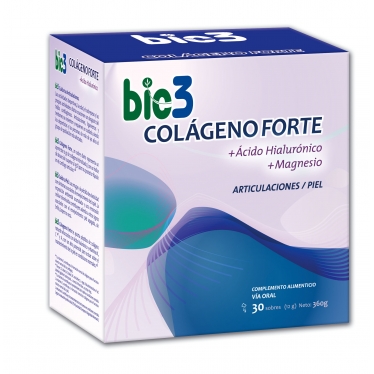 BIO 3 Forte Colágeno es un potente suplemento dietético que contiene una mezcla única de ingredientes que contribuyen al cuidado de las articulaciones, huesos y piel. Está enriquecido con ácido hialurónico y magnesio, para ayudar a mantener nuestra energía y sentirnos mejor. El colágeno es necesario para la producción de glucosamina, condroitina y ácido hialurónico, que juntos actúan como una red para unir los tejidos conectivos. El magnesio también se une a esta red para ayudar a normalizar la actividad muscular, a mantener los niveles de energía y a reducir el dolor en las articulaciones.