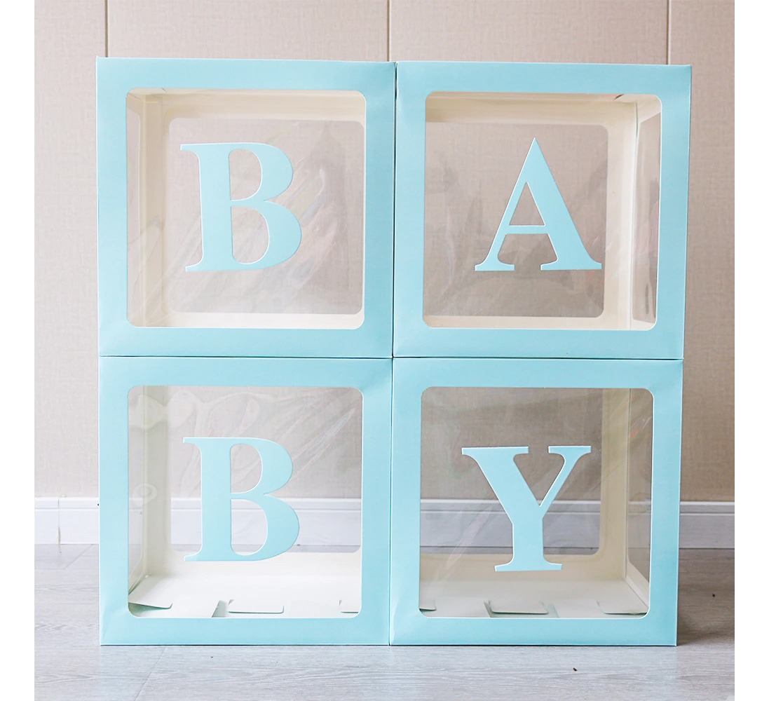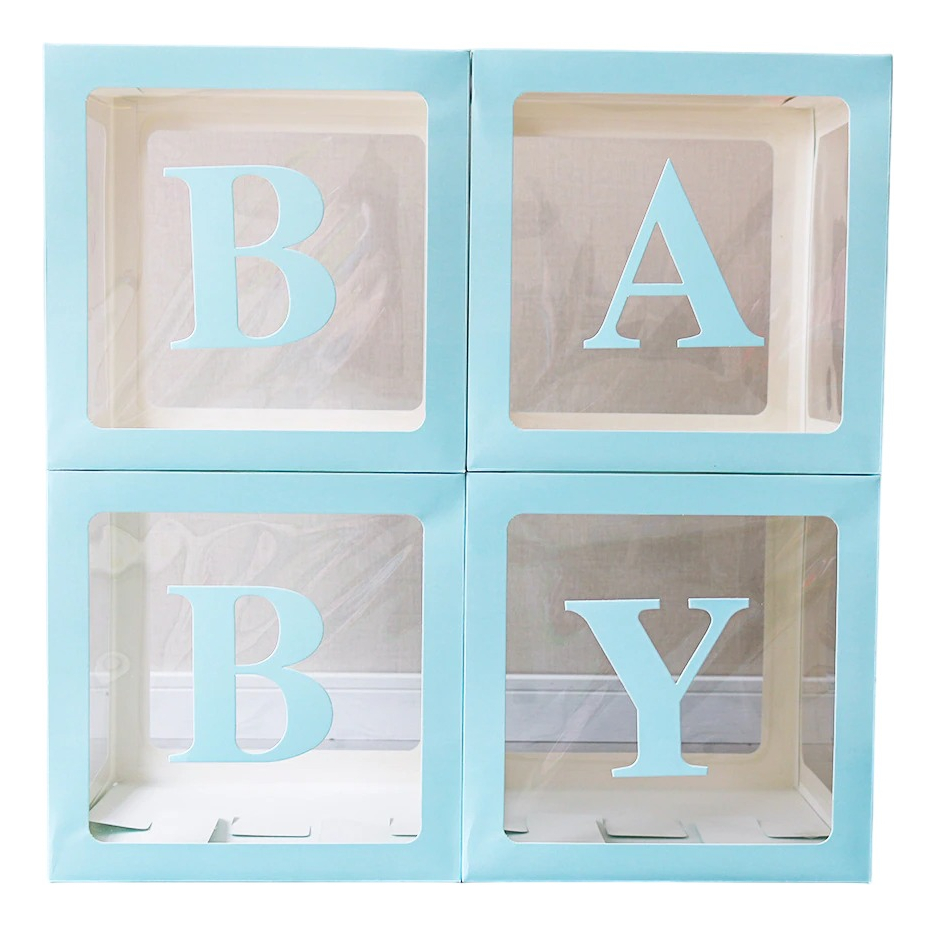 Cajas decorativas con letras para formar la palabra BABY (vienen para colocarlas luego del armado de las cajas)