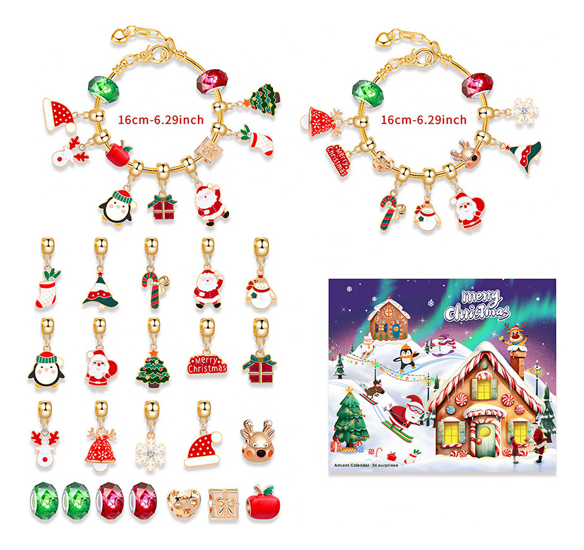 - 22 Dijes y Cuentas de Colección: Cada uno de los 22 días restantes revela un dije o cuenta única. La colección incluye una amplia gama de elementos festivos: figuras esmaltadas de colores vibrantes (rojo, verde, dorado), perlas de fantasía, y motivos clásicos como el Muñeco de Nieve, el Reno, el Árbol Decorado y la Corona Navideña. La variedad de formas y colores permite una mezcla y combinación que estimula la creatividad y el diseño.