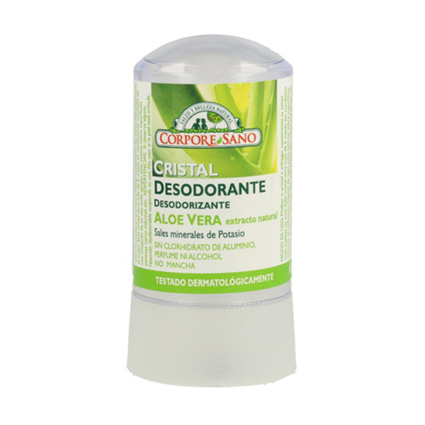 Desodorante Cristal Aloe de Corpore Sano tambiene s conocido como Desodorante mineral con aloe vera es un desodorante es natural y no mancha. Este desodorantes es poco soluble en agua y tiene propiedades astringentes sobre la piel.
