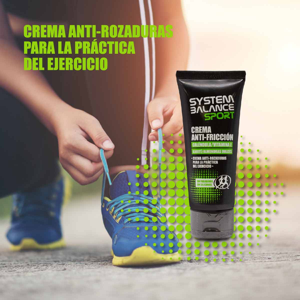 La Crema Anti-Fricción System Balance está indicada para evitar rozaduras propias de las fricciones que se producen durante la actividad deportiva debido al contacto de la piel con los tejidos y el material deportivo. También se le conoce con el nombre de crema antirozaduras, capaz de formar una película, a esto se le conoce como la formación de una capa protectora que consigue proteger la piel de las zonas afectadas, cuando se lleva a cabo la actividad física. También se puede utilizar en las axilas, los pezones, los pies para evitar la rozadura con las zapatillas. Formulada con ingredientes naturales como son: Aceite de Almendras, Manteca de Karité y Aceite de Caléndula.