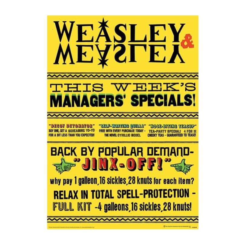 Este Cuadro Sortilegios Weasley está impreso en papel de alta calidad, destacando los brillantes colores amarillos y negros que caracterizan las promociones y anuncios de los gemelos Weasley. Con un tamaño ideal, el diseño presenta un estilo llamativo y un formato que imita un clásico cartel de ofertas, haciendo de él una adición única y divertida para cualquier colección de Harry Potter.