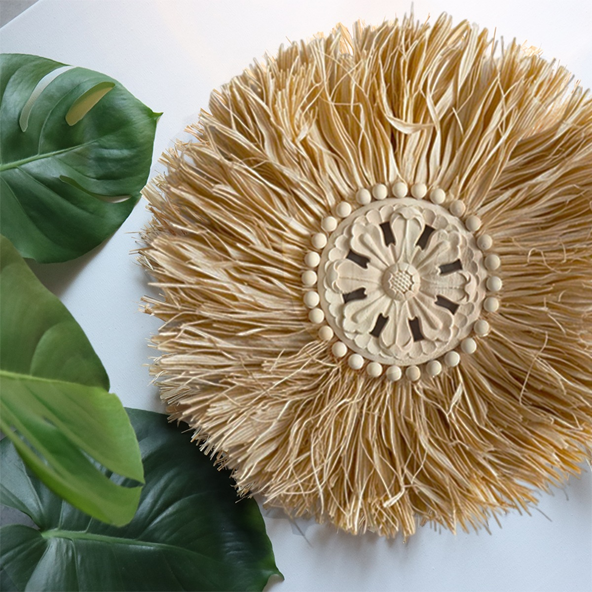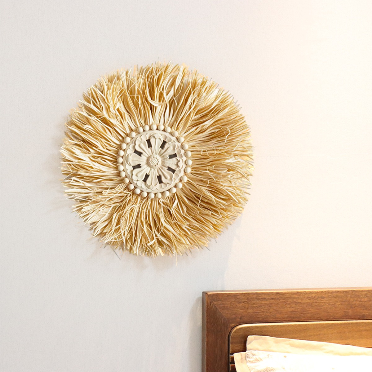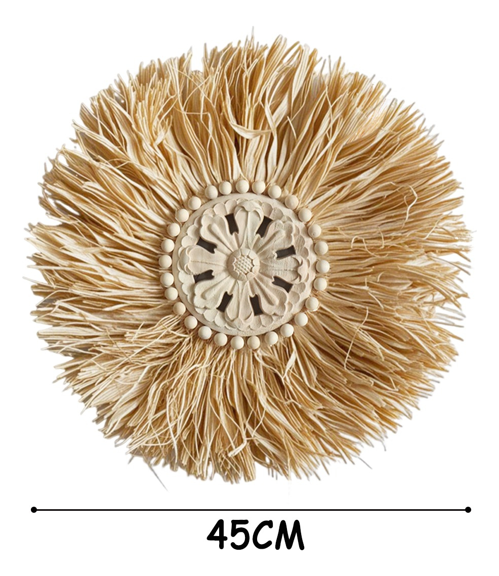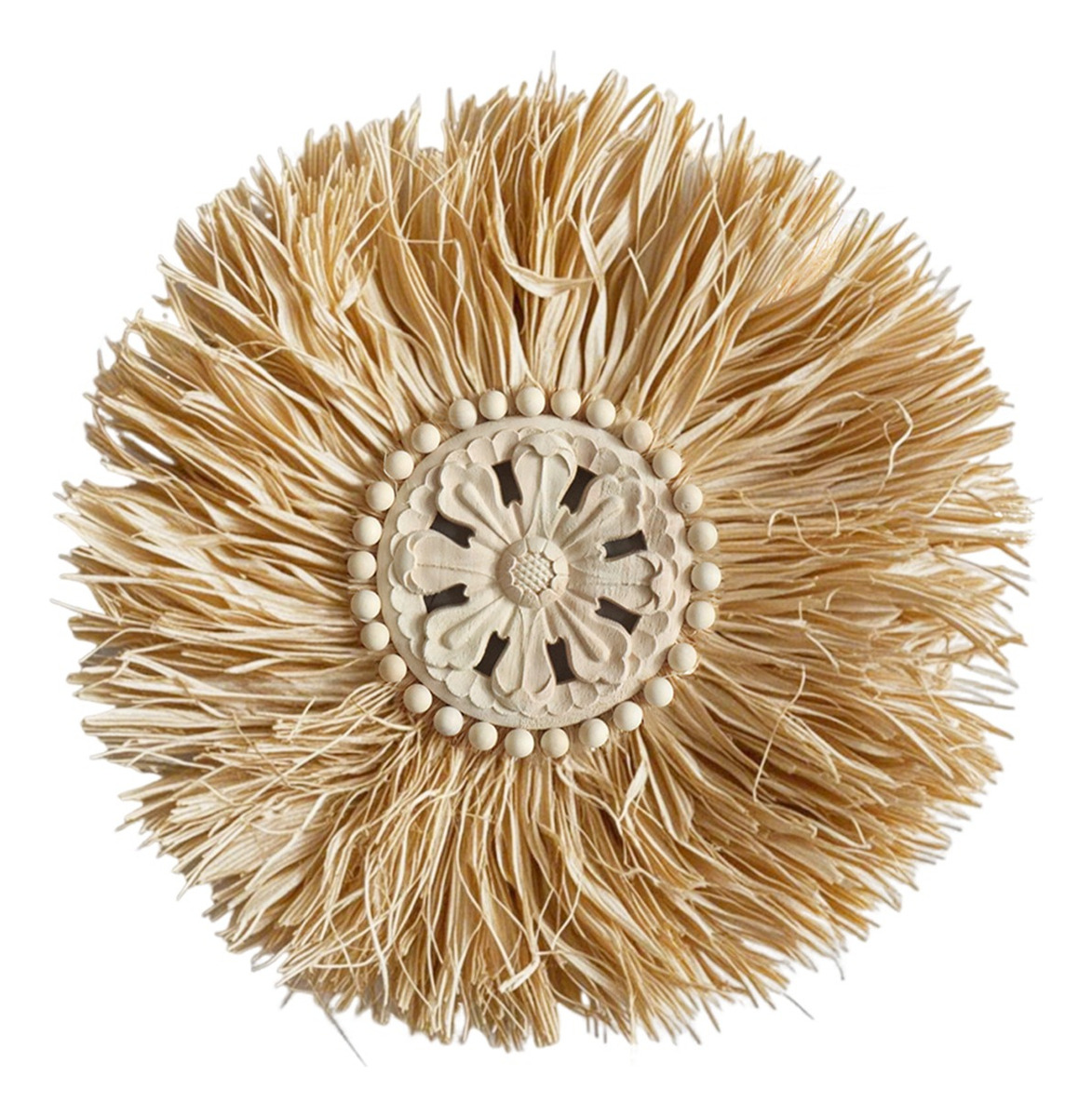 Elegante decoración de pared en estilo boho, confeccionada con fibras naturales y un centro artesanal tallado. Su diseño circular y textura orgánica la convierten en una pieza ideal para aportar calidez, estilo y personalidad a cualquier ambiente. Perfecta para livings, dormitorios o espacios creativos que busquen una estética natural y relajada.