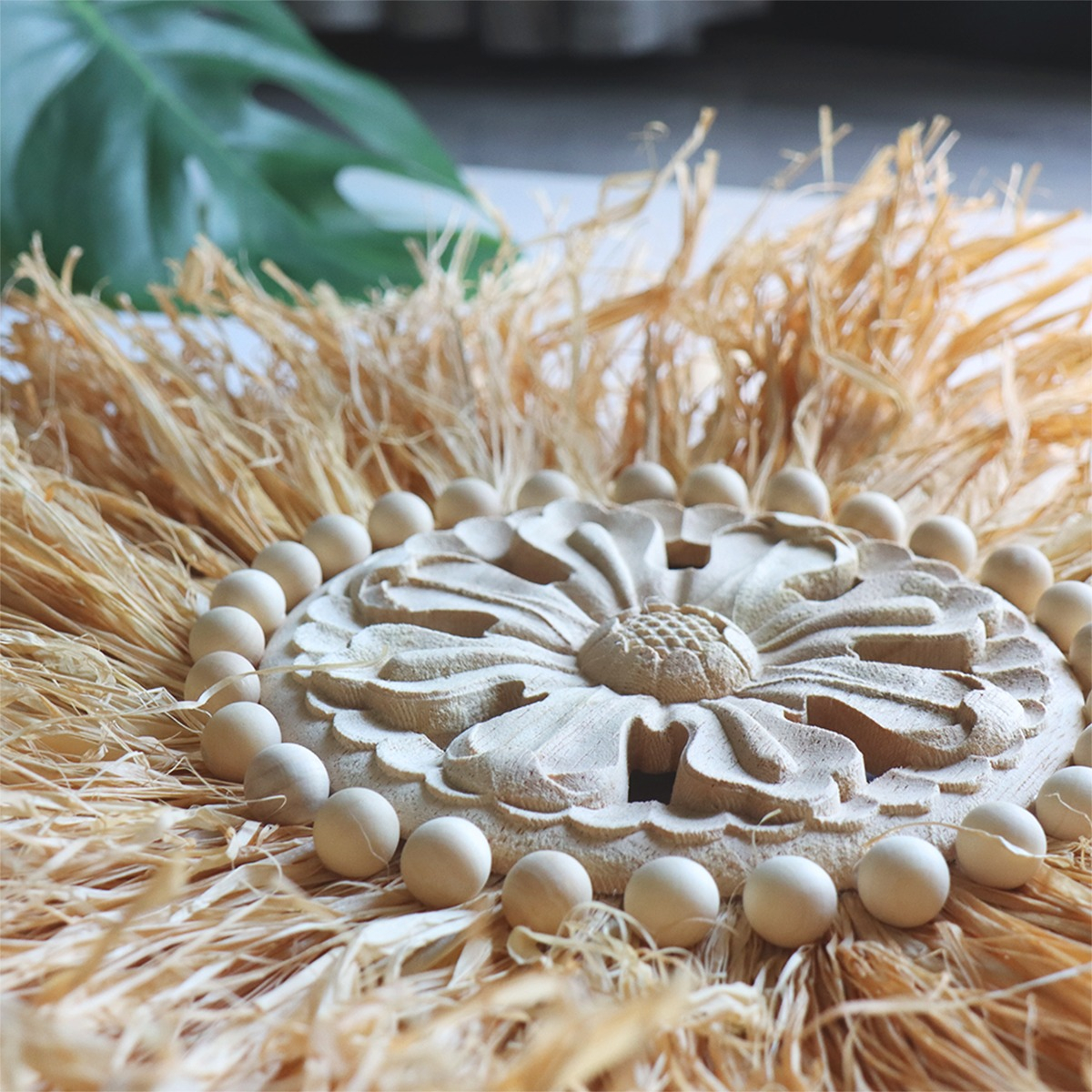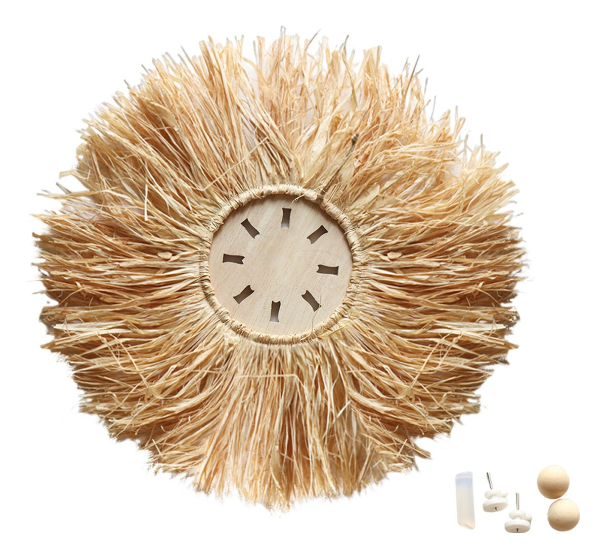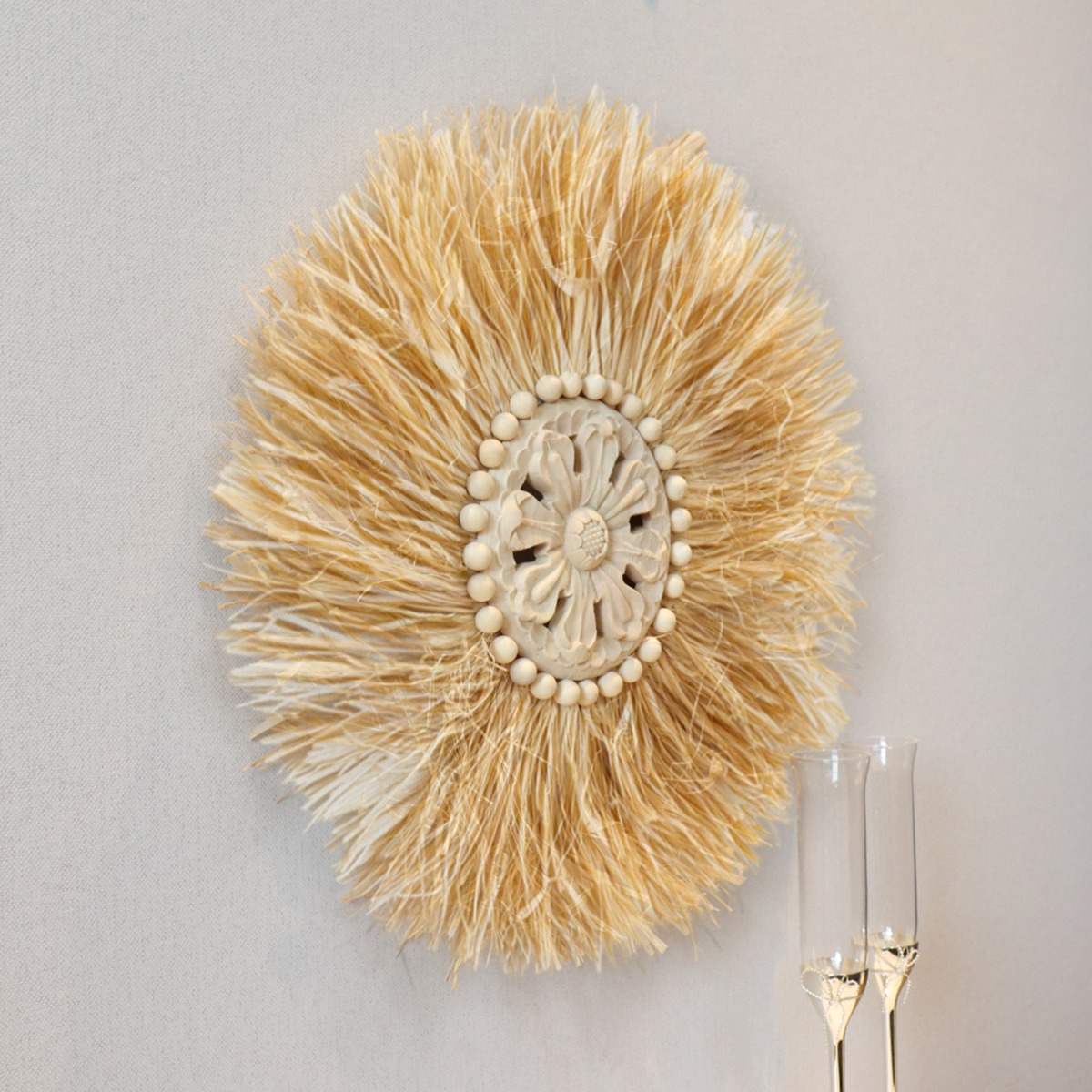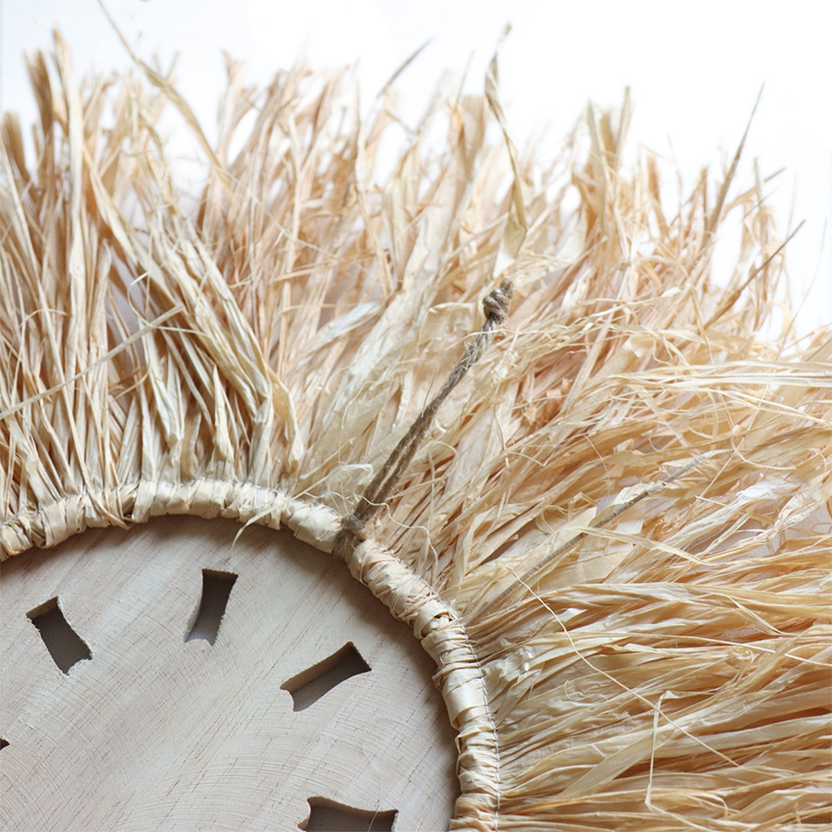 Elegante decoración de pared en estilo boho, confeccionada con fibras naturales y un centro artesanal tallado. Su diseño circular y textura orgánica la convierten en una pieza ideal para aportar calidez, estilo y personalidad a cualquier ambiente. Perfecta para livings, dormitorios o espacios creativos que busquen una estética natural y relajada.