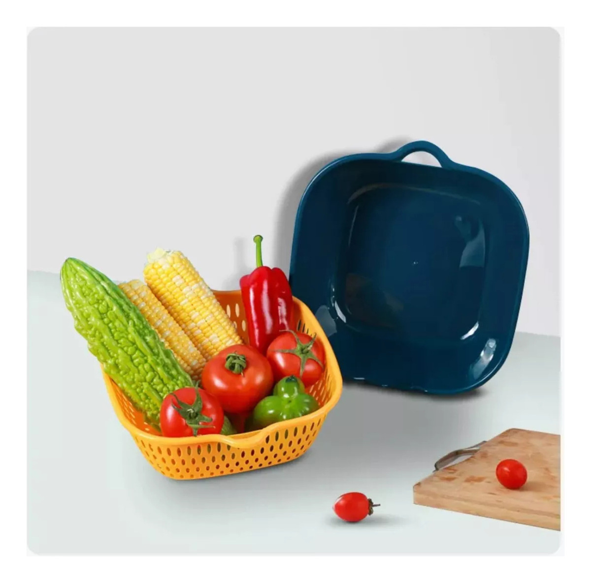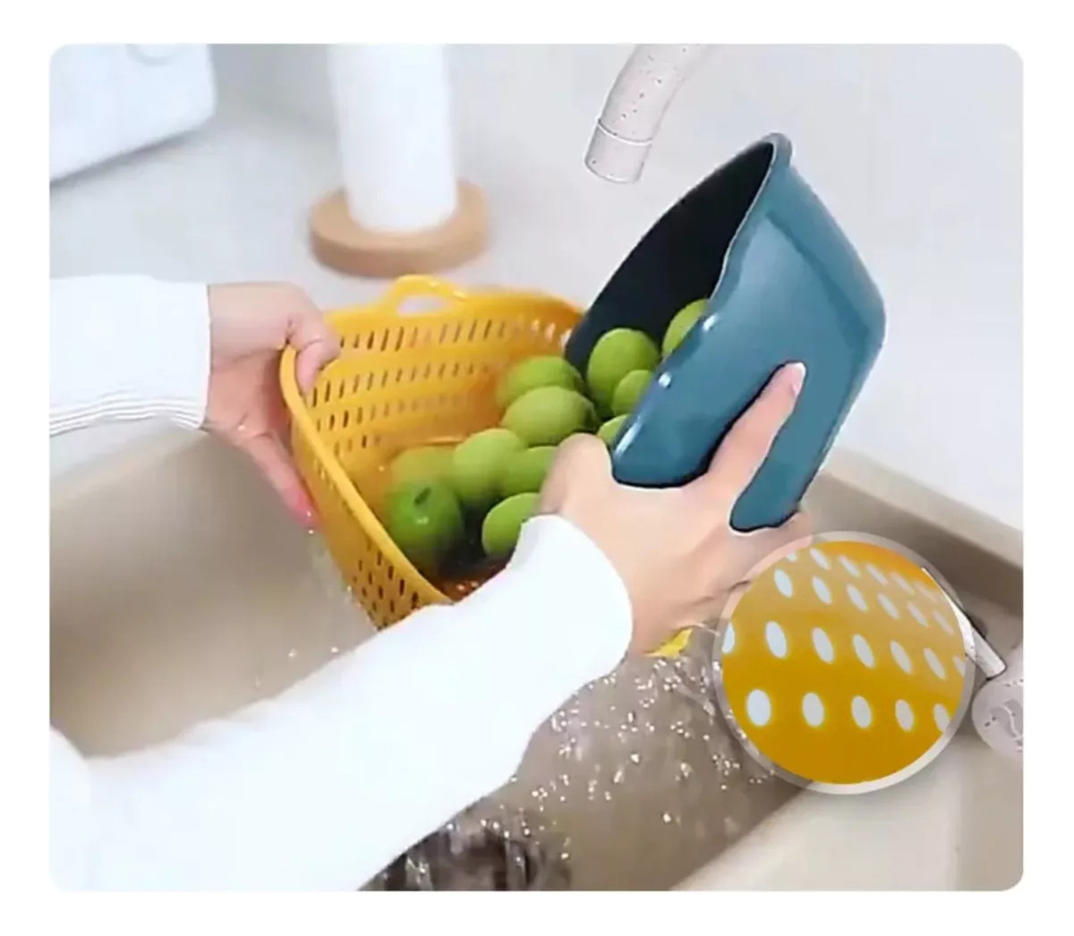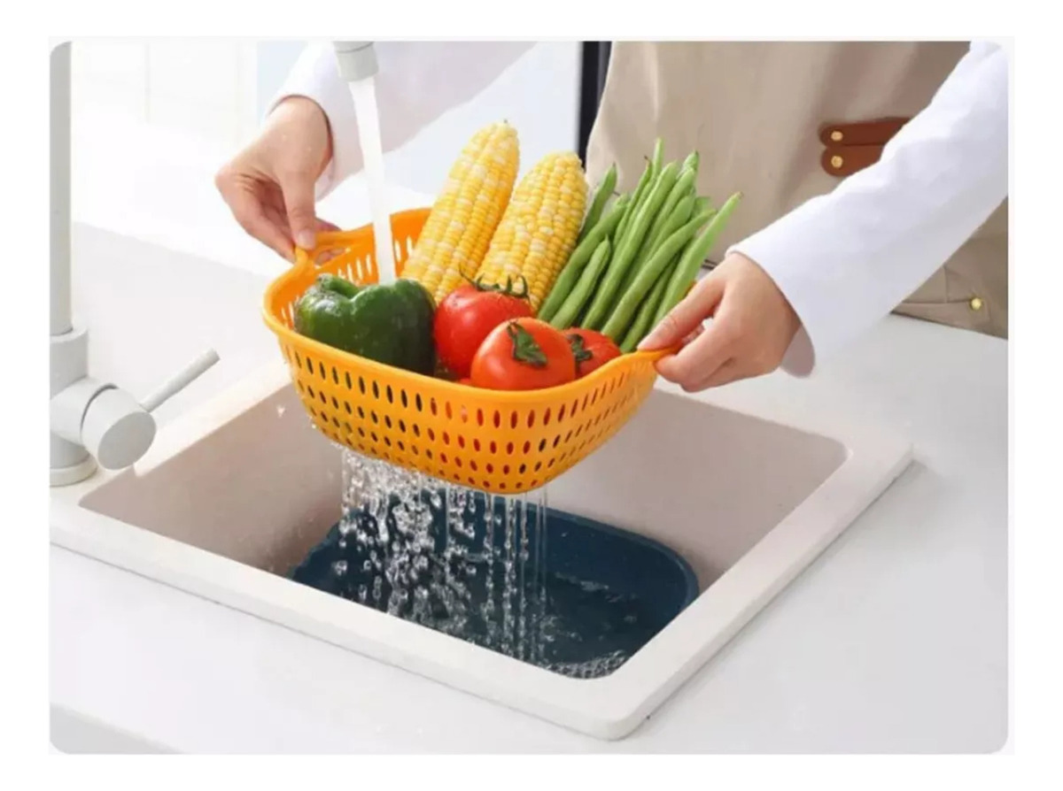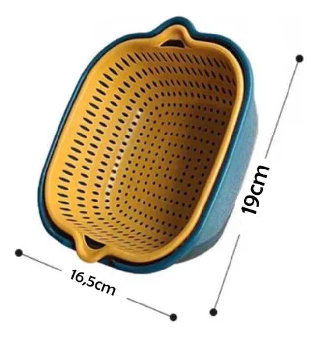 Colador ideal para lavar frutas, vegetales y mucho más. Gracias a su recipiente volcador con abertura en el borde, permite verter el agua fácilmente mientras retiene los alimentos. Su diseño compacto incluye un hueco para colgarlo, lo que facilita su almacenamiento.