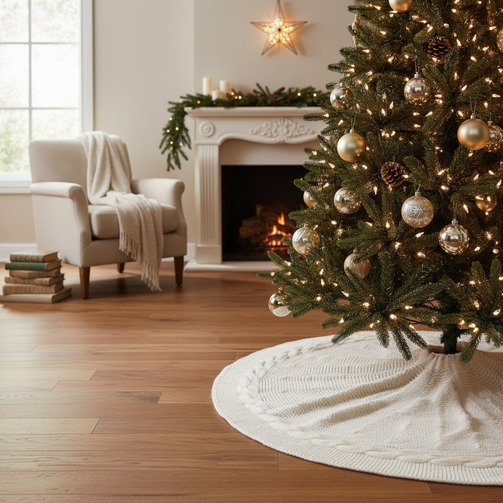 Vestí la base de tu arbolito con esta falda tejida trenzada. Su textura tipo punto cable en tono claro eleva la decoración y oculta el pie del árbol, logrando un look prolijo y acogedor.