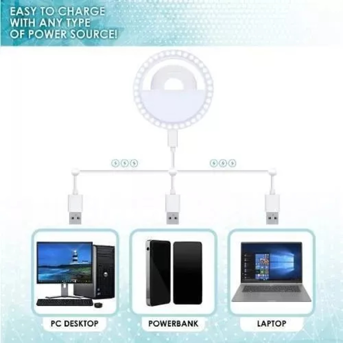 Anillo LED ideal para tomar selfies en teléfonos inteligentes, PC, etc. Con 36 luces LED y tres ajustes de brillo proporciona la iluminación necesaria para tomar fotos o vídeos. Una batería recargable USB integrada con cable de carga hace que sea fácil mantener los LED encendidos.