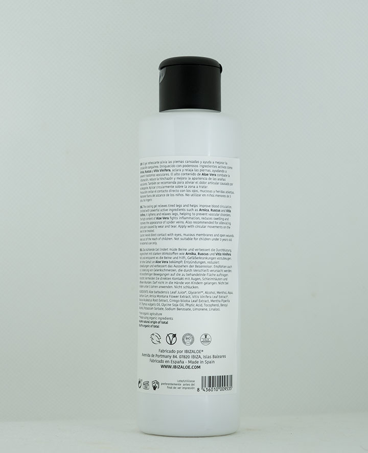 El gel frío aloe vera de Ibizaloe está especialmente formulado para aliviar la sensación de piernas cansadas, pesadas y fatigadas, aportando un efecto frío inmediato que refresca y reconforta la piel.