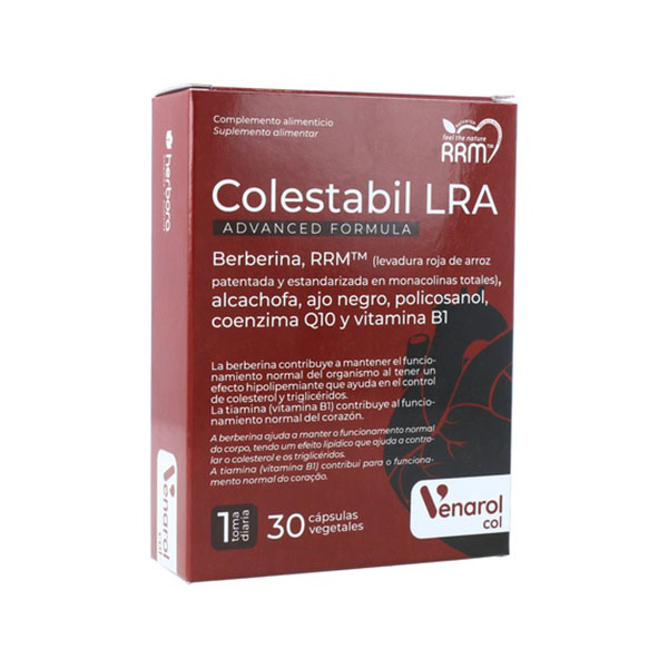 Venarol Herbora presenta Colestabil LRA Advanced Formula, un complemento nutricional con 30 cápsulas formuladas con ingredientes naturales de alta calidad. Aquí hay una lista de los ingredientes en la fórmula: berberina, RRM™ (levadura roja de arroz patentada y estandarizada en monacolinas totales), alcachofa, ajo negro, policosanol, coenzima Q10 y vitamina B1.