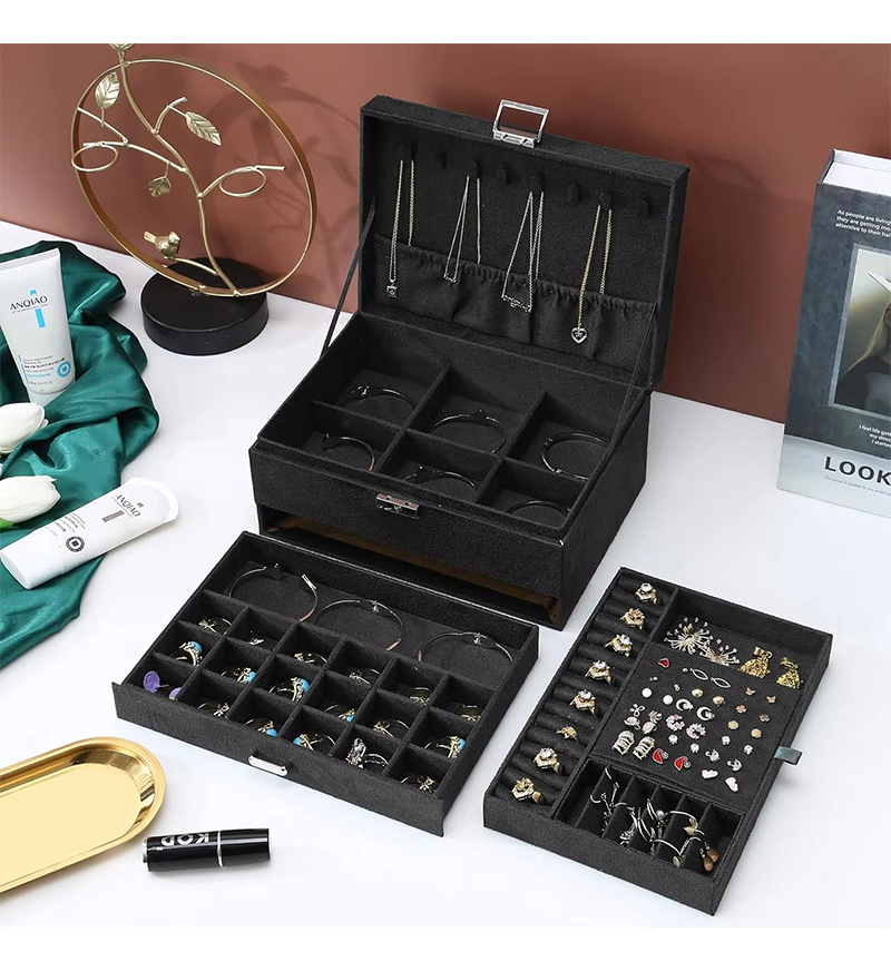 Este elegante joyero organizador de 3 capas es la solución perfecta para mantener tus joyas siempre ordenadas y protegidas. Con múltiples compartimentos, te permite almacenar anillos, pulseras, collares y más, evitando enredos y daños.