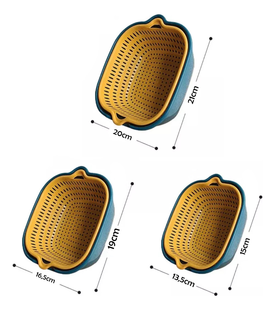 Pack de 3 coladores ideales para colar pastas, lavado de vegetales, y mucho más. Puedes utilizarlos en la heladera para mantener tus alimentos ya que cada colador incluye una base para retener líquidos, lo que lo hace ideal para evitar que alimentos delicados como la lechuga se desmejore.
