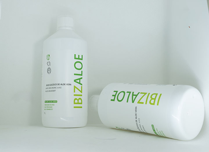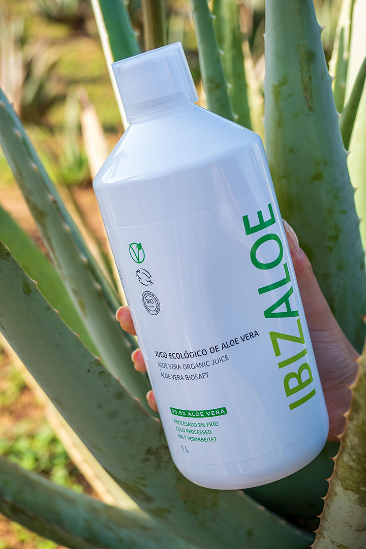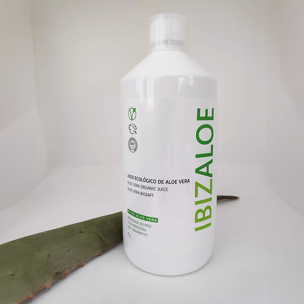 Jugo de Aloe Vera ecológico 99,8% para beber, elaborado con aloe fresco de nuestras plantaciones en Ibiza. Procesado en frío, sin conservantes ni colorantes. Tradicionalmente utilizado como complemento en el cuidado digestivo y el bienestar general.