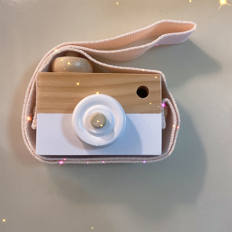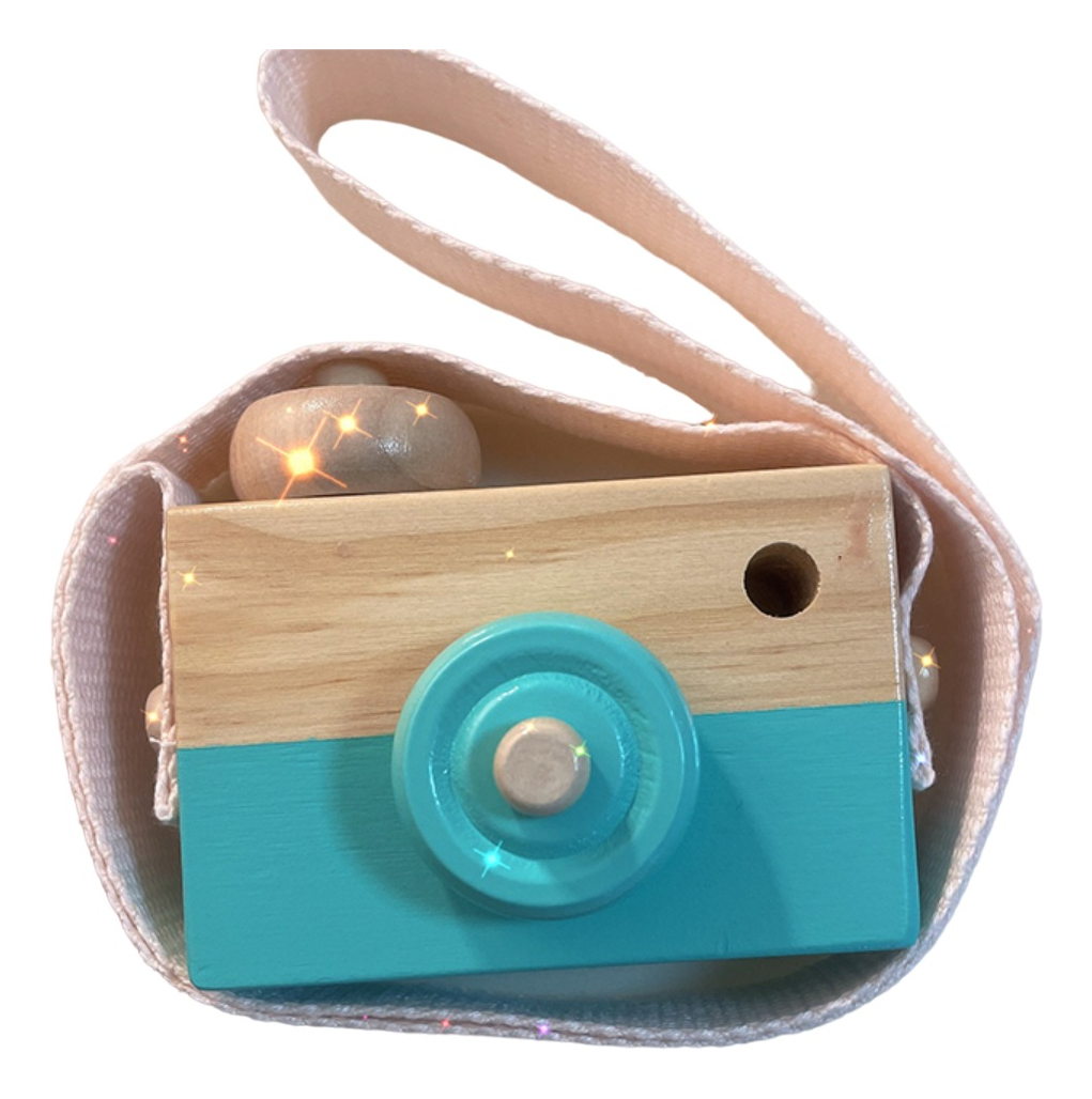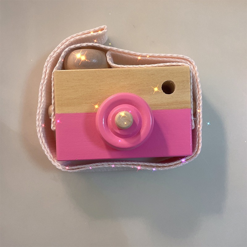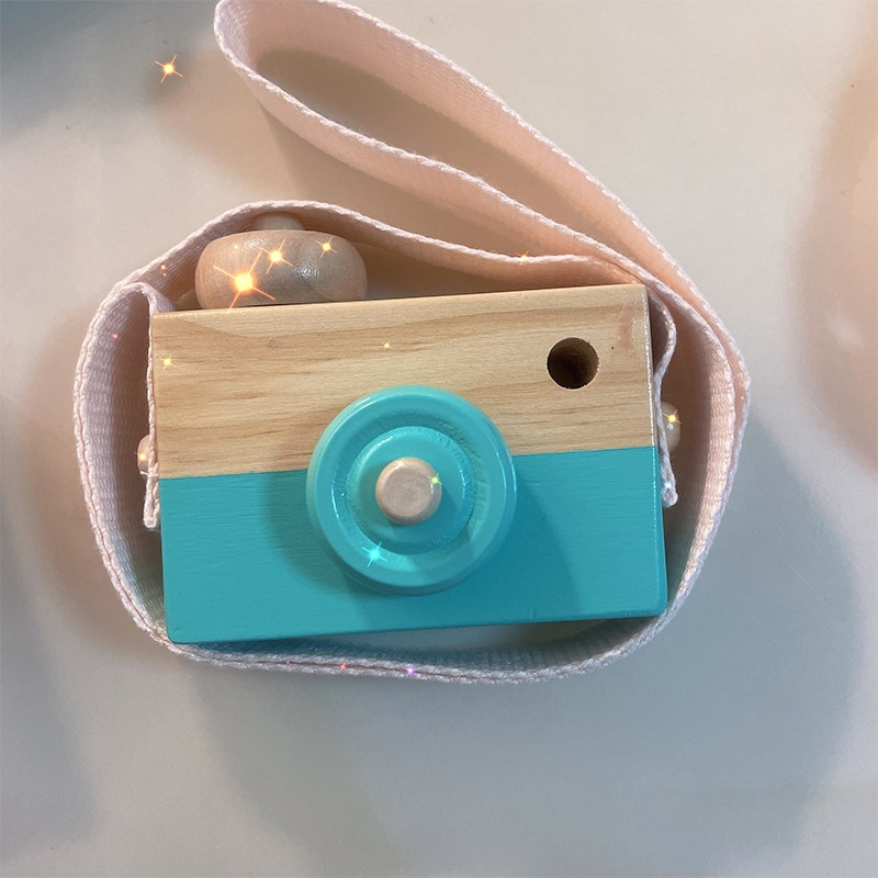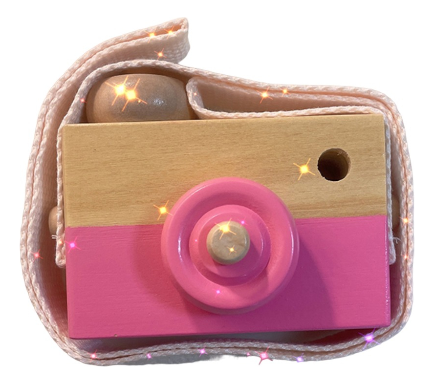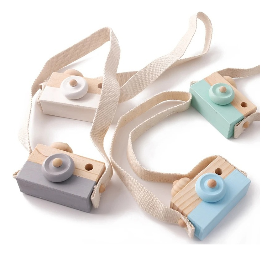 Cámara de fotos en madera juguete para niños y niñas, ideal para disfrutar de un momento alejado de pilas, sonidos y luces. Su diseño nórdico y sus colores calmos ayudan a buscar el juego desde un punto mas relajado.