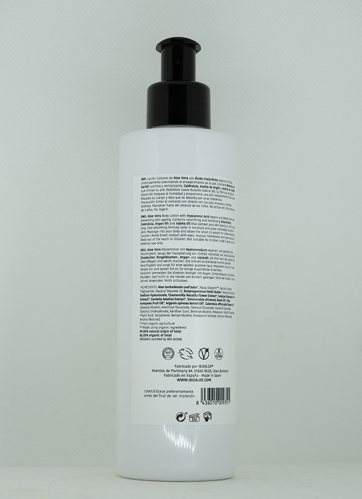 Loción corporal de Aloe Vera con Ácido Hialurónico repara e hidrata en profundidad. Contiene extractos y aceites nutritivos y reparadores que proporcionan suavidad y tersura. Contiene Ácido Hialurónico ,Aloe Vera, Manteca de Karité, Aceite de Jojoba, Vitamina E, Aceite de Argán, Aceite de Caléndula, Manzanilla, Açai y Centela asiática. Recomendada para pieles sensibles.