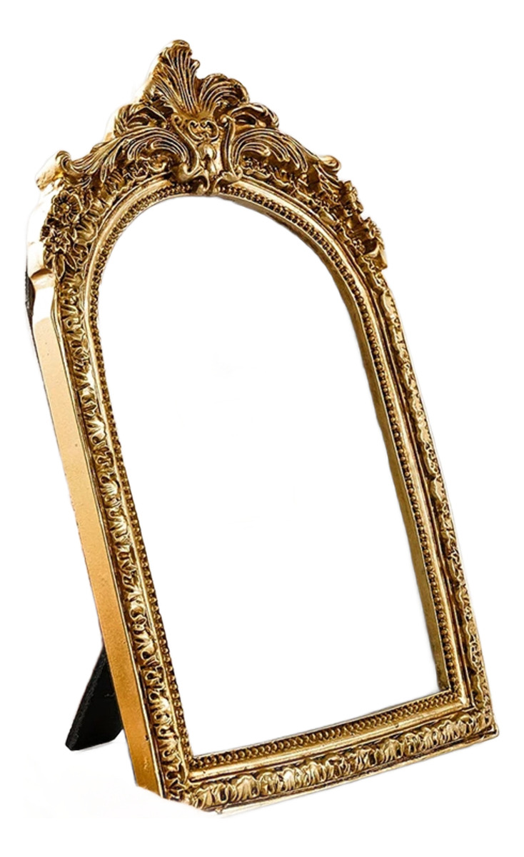 Este elegante marco de fotos vintage, con un borde dorado y forma de arco, es perfecto para destacar tus recuerdos más preciados. Su diseño clásico y tamaño compacto lo hacen ideal para decorar cualquier espacio, añadiendo un toque de sofisticación y encanto retro. Perfecto para colocar en mesas, estanterías o como parte de una galería de pared, este marco es un complemento decorativo que realza la belleza de tus fotografías.