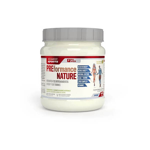 PREformance Nature de MARNYS SPORTS® es una formula Pre-Entrenamiento con extractos naturales de Cafeína y Colina que facilitan el metabolismo de las grasas, aportando un contenido energético que retrasa el comienzo de la fatiga.