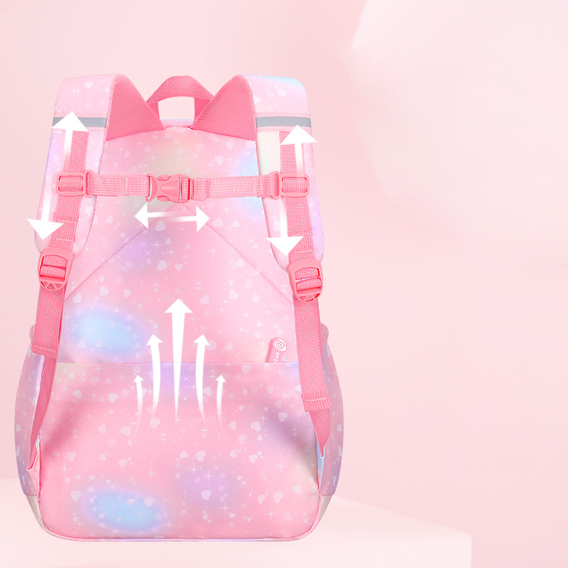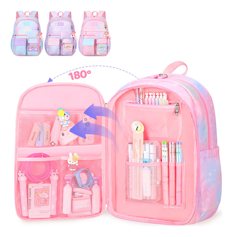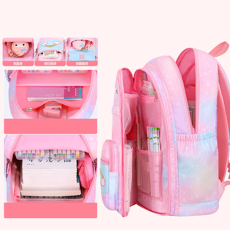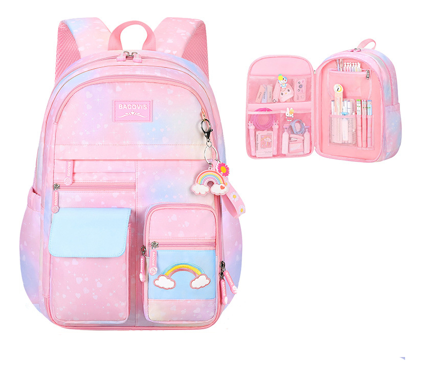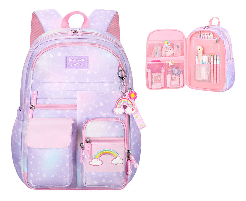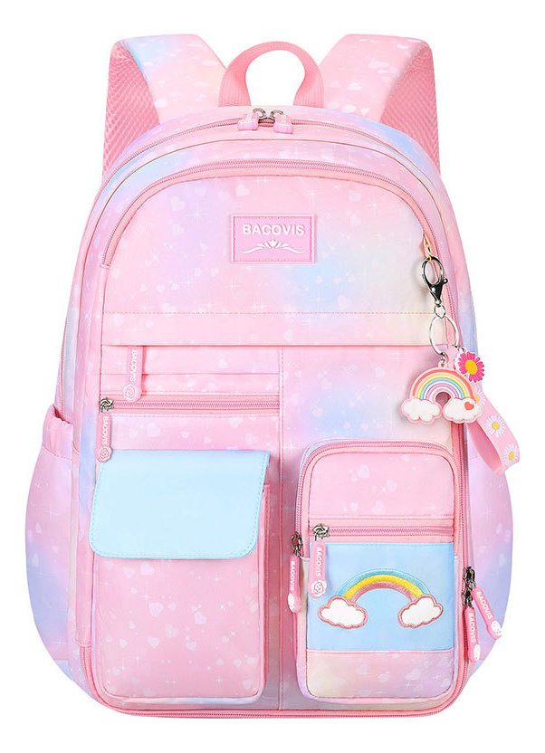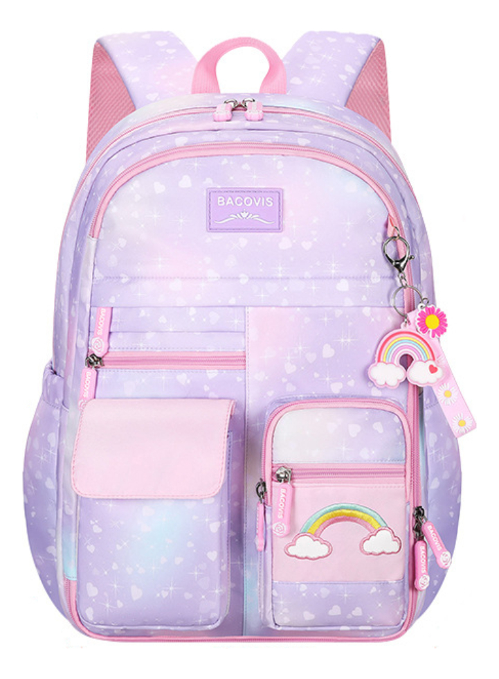 Esta encantadora mochila escolar para niñas presenta un vibrante diseño de arcoíris que alegrará cualquier día de clase. Fabricada en material impermeable, protege los libros y útiles escolares de la humedad. Su amplio compartimento principal y bolsillos adicionales ofrecen espacio suficiente para llevar todo lo necesario, mientras que las correas ajustables aseguran comodidad en el transporte.