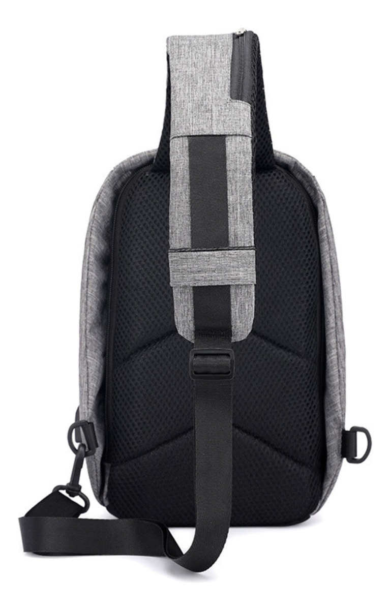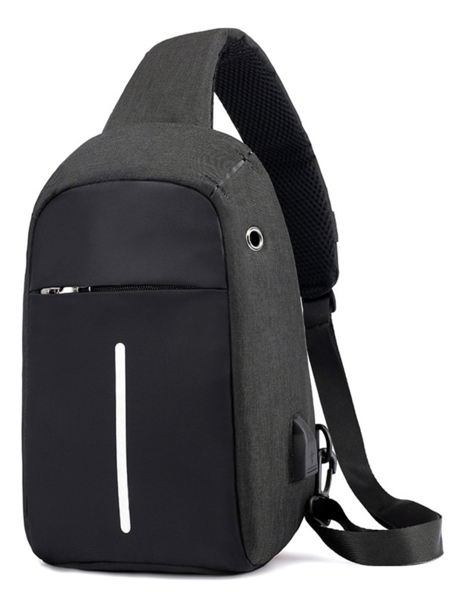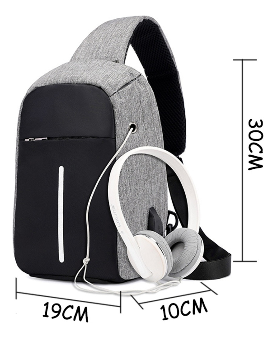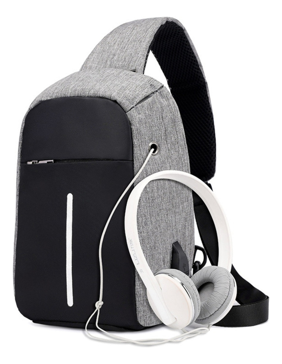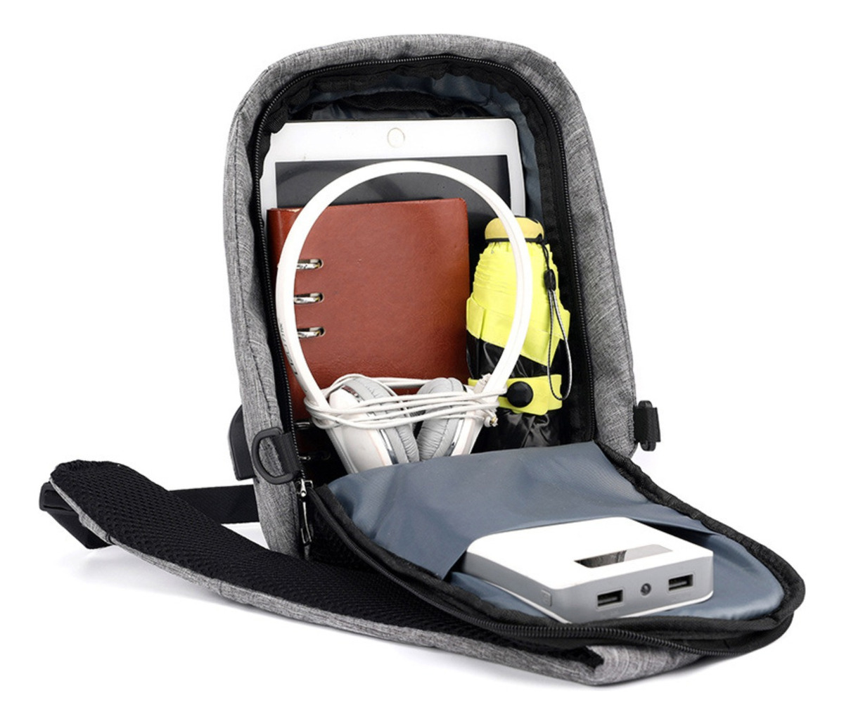 Morral tipo mochila antirrobo, con salida USB para conectar un Power Bank y salida de auriculares.
