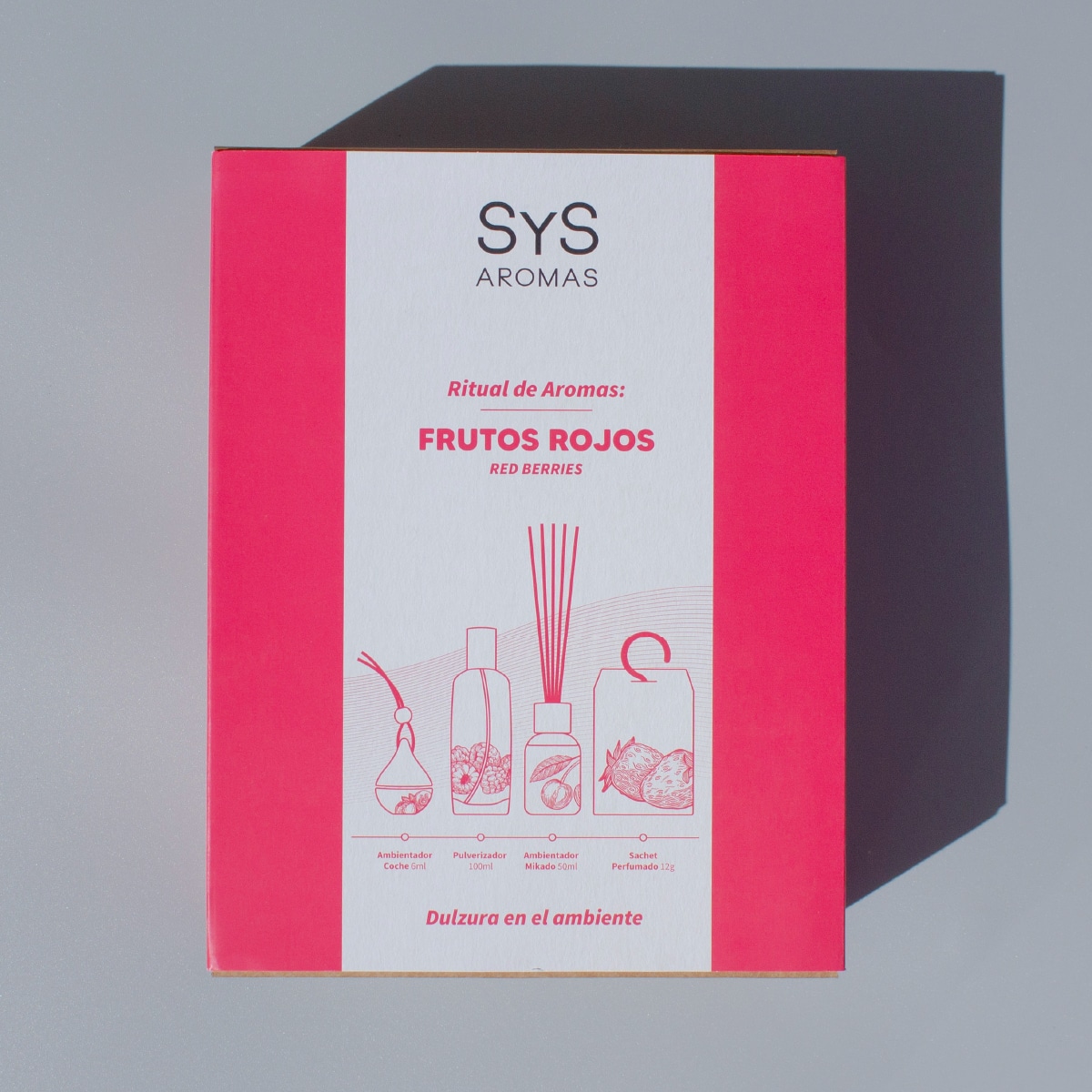 - Frutos Rojos: el clásico que nunca pasa de moda. Este pack incluye 4 productos de nuestro aroma más vendido: Ambientador de Coche 6ml, Pulverizador 100ml, Mikado 50ml y Sachet Perfumado 12g.