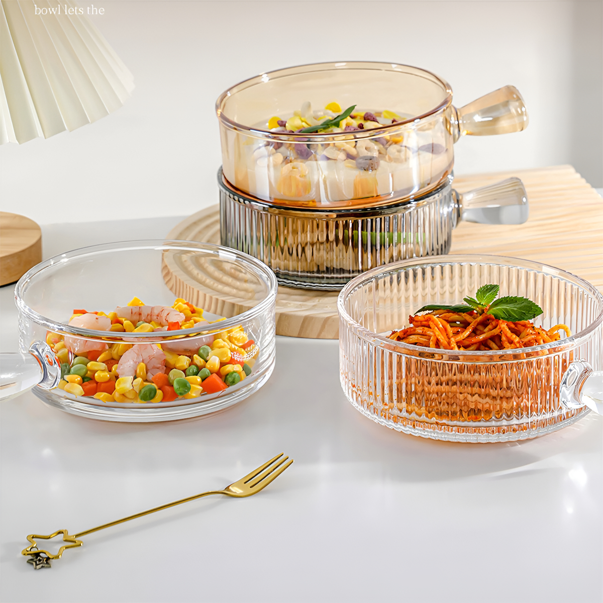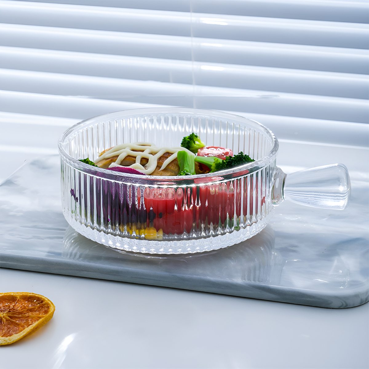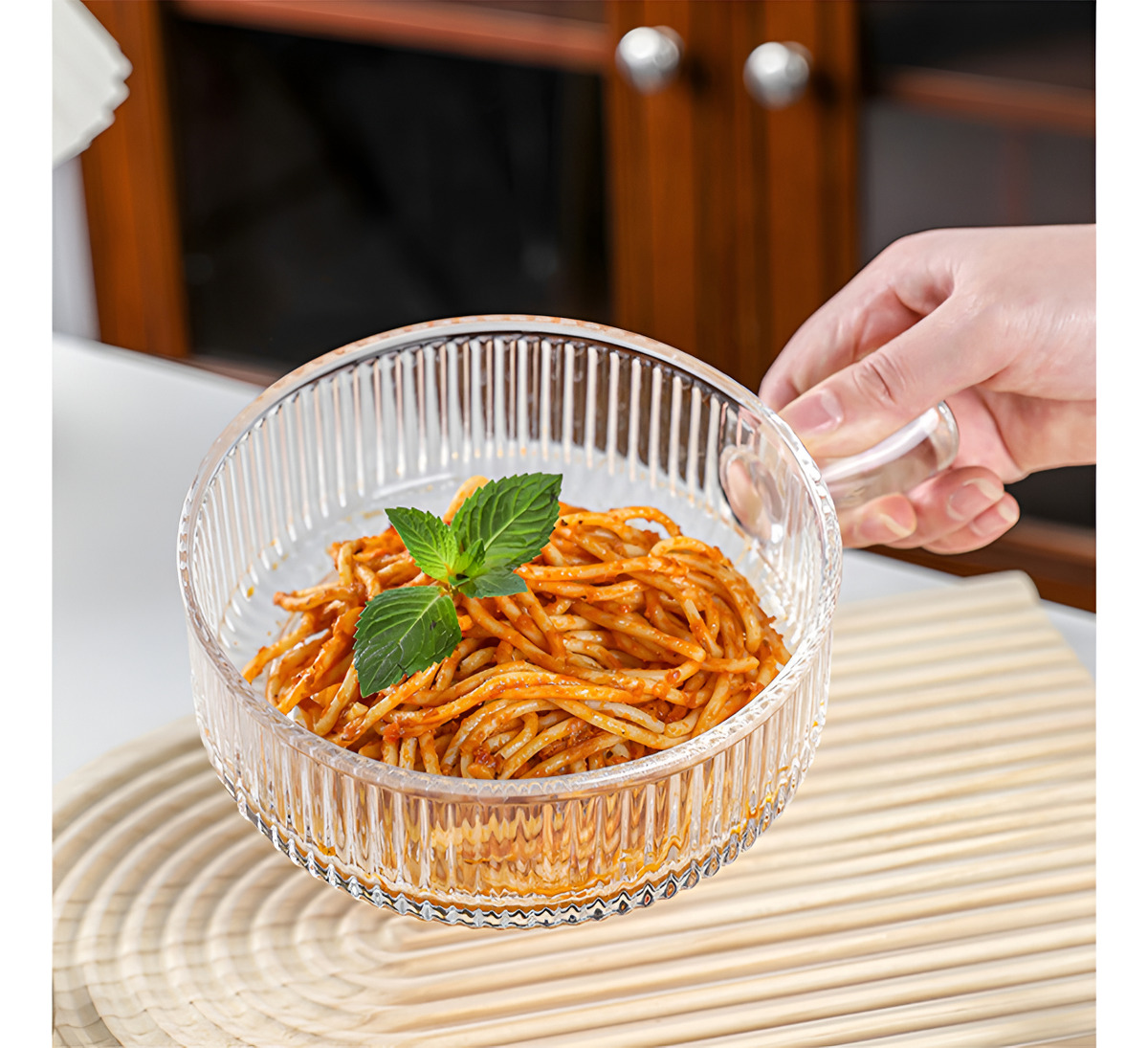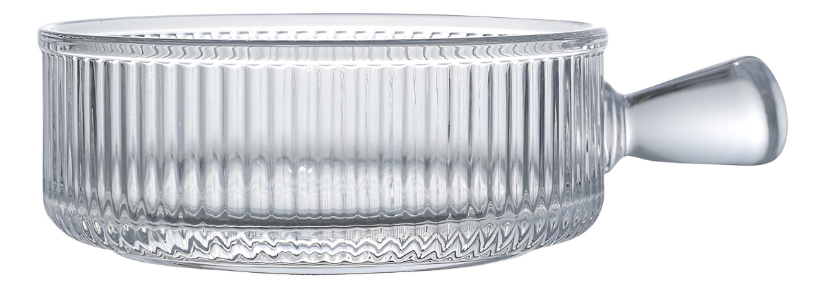 Dale un toque moderno a tu mesa con este plato hondo estilo cazuela de vidrio con asa. Su diseño acanalado realza la presentación de sopas, pastas, ensaladas o copetín, y el asa facilita el servicio con seguridad.