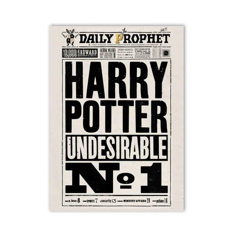 Sumérgete en la historia con nuestro Póster Periódico Harry Potter, que presenta el famoso titular del Profeta Diario declarando a Harry como «Indeseable Nº 1». Este Póster evoca un momento crítico en la saga de Harry Potter, representando la intensa persecución y el conflicto que enfrenta. Ideal para cualquier fan de la serie, este Póster añade un toque dramático y auténtico a tu colección.