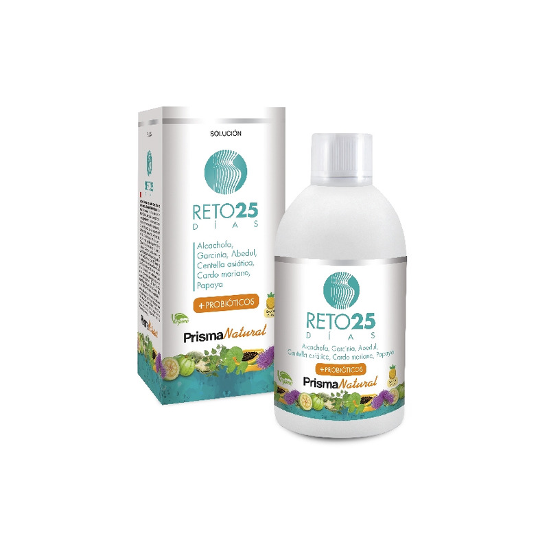 Prisma Natural ha diseñado el producto innovador RETO25 DÍAS, una solución natural para el control de peso. El cuidadoso aprovechamiento de plantas con propiedades diuréticas, detoxificantes, quemagrasas, energizantes y antioxidantes, hace de esta solución la más completa para el control de peso en el mercado. Su sabor a piña, hace de la experiencia de consumir el producto una experiencia agradable.