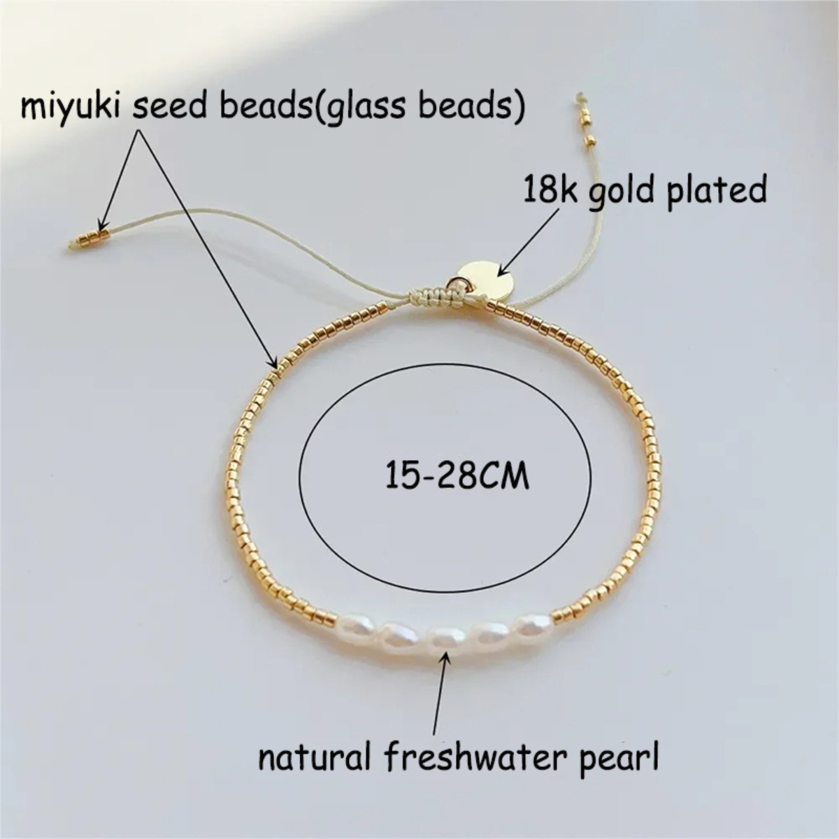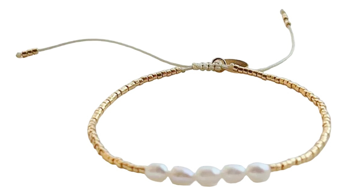 Pulsera dorada en mostacillas de vidrio, con detalle enchapado en oro, Ajustable hasta 28cm de diámetro de muñeca.