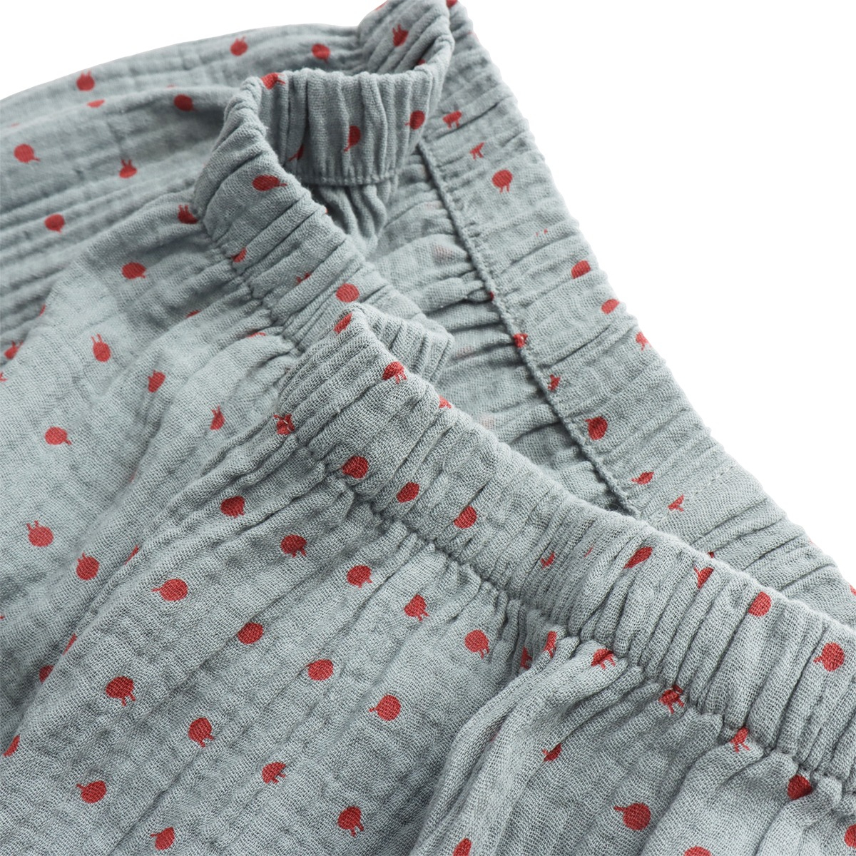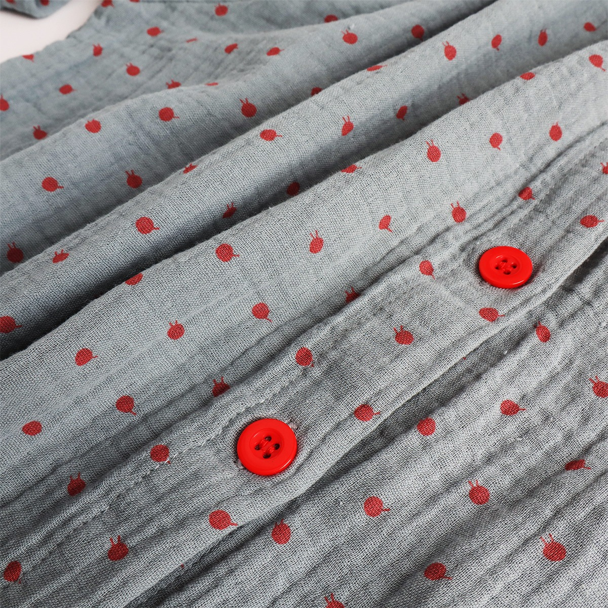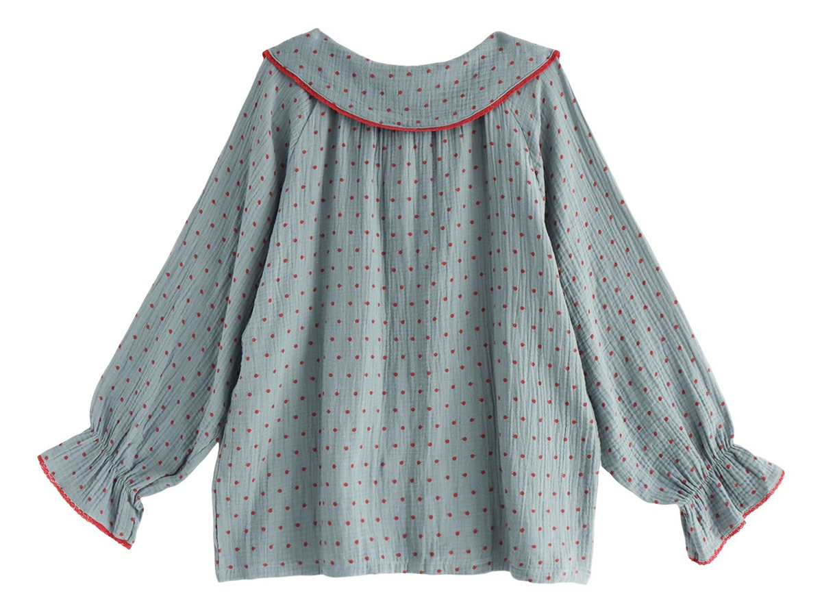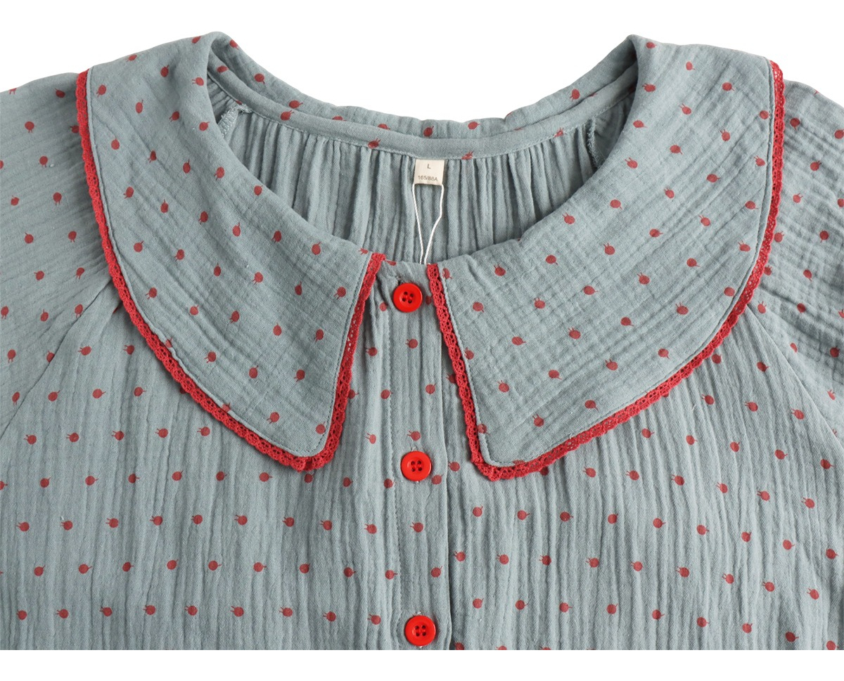 Este encantador conjunto de pijama de dos piezas combina comodidad y estilo para tus momentos de descanso. La blusa de manga larga presenta un diseño clásico con cuello camisero y cierre frontal con botones, adornada con un delicado estampado de puntos rojos que aporta un toque femenino y alegre. El pantalón largo, con cintura elástica, asegura un ajuste cómodo y libertad de movimiento durante la noche. Confeccionado en un tejido suave y ligero, este pijama es ideal para mantenerte cómoda en noches frescas sin sacrificar el estilo.