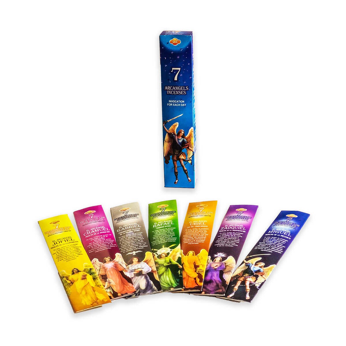 Varillas de incienso de los 7 Arcángeles uno para cada día de la semana:Jofiel con Mil Flores, Samuel con Rosa y Miel, Gabriel con Sándalo, Rafael con Jazmín, Uriel con Canela, Zadquiel con Violeta y Miguel con Ruda.