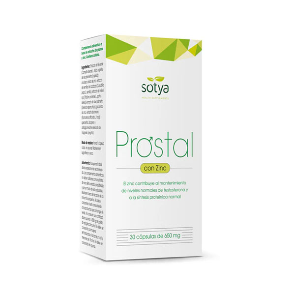 Prostal con Zinc 30 capsulas Sotya es un suplemento alimenticio construido para ayudarle a mantener una próstata saludable. Con su acción antiinflamatoria, antivírica, antioxidante y regeneradora, es indicado en casos de inflamación de próstata.