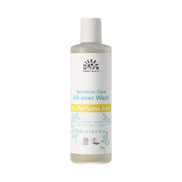 Urtekram No Perfume Baby All-Over Wash contiene aloe vera y glicerina para nutrir la piel suave de tu bebé y, por supuesto, que las burbujas no escuezan los ojos de tu bebé. Un poco de producto rinde mucho y puedes usar fácilmente el mismo lavado tanto para el cuerpo como para el cabello. Certificado por Ecocert Cosmos Organic, vegano y de origen natural.