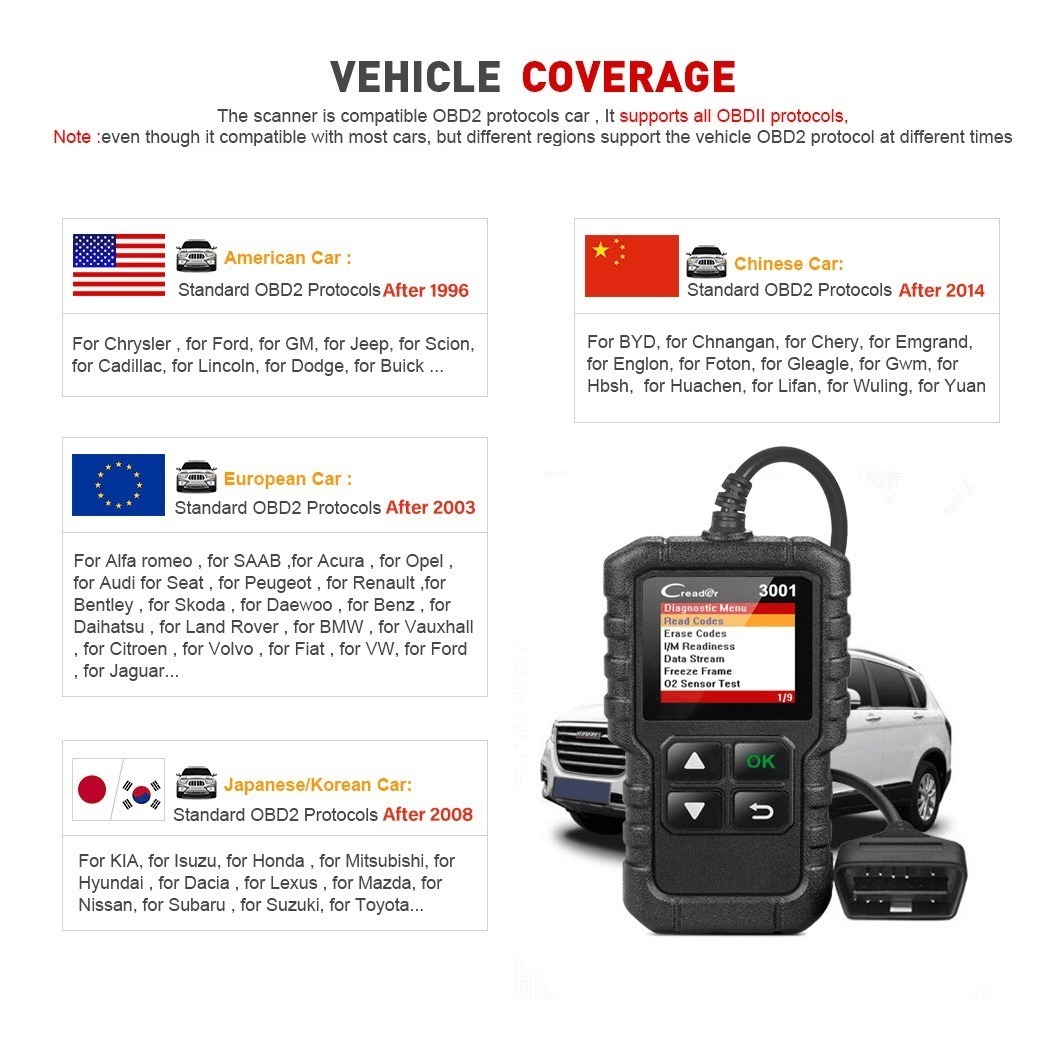 1. A pesar de que es compatible con la mayoría de los coches, pero las diferentes regiones admiten el Protocolo OBD2 del vehículo en diferentes momentos, o algunos coches tienen un diseño especial, por lo tanto, puede que no sea compatible con algunos coches que no admiten el Protocolo OBD2. Marcas de automóviles especialmente japonesas y coreanas.